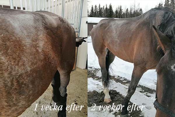 Efter starten av MicroVital började det bildas nytt hår på de hårlösa delarna av kroppen inom en vecka, och hästens färg blev mörkare. Inom tre veckor hade hårbeläggningen till största delen återhämtat sig på de hårlösa områdena.