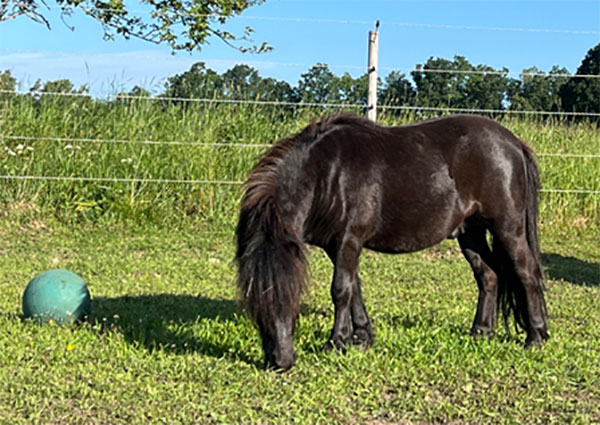 Sam är en liten svart shetlandsponny som ägaren köpte när han var 1 år gammal (2023), då ägaren letade efter en lekkamrat till sitt senaste föl.