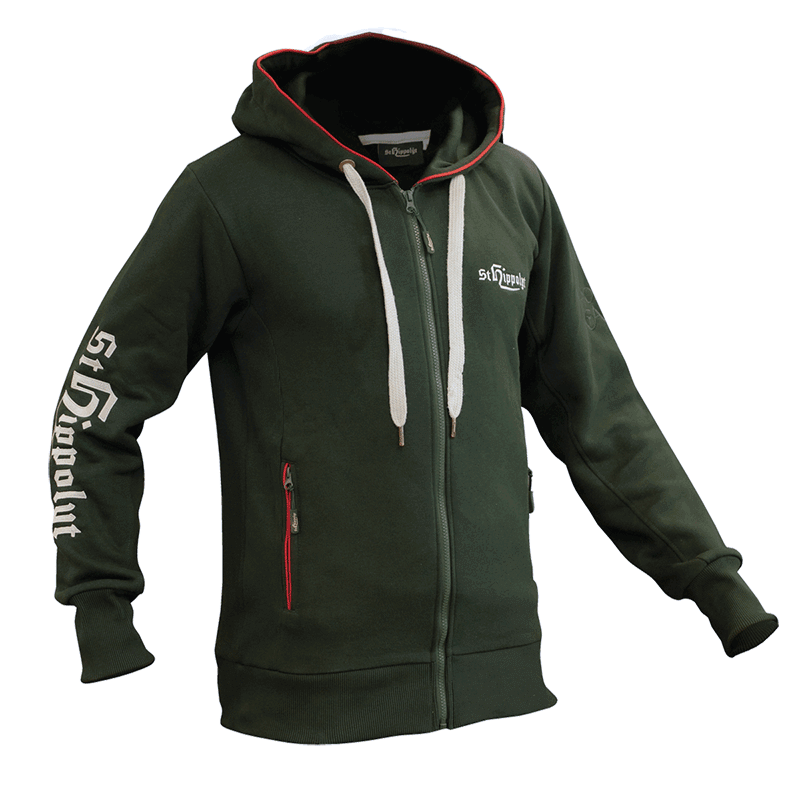 Avslappnad, bekväm och modemedveten – de nya sweatshirtjackorna i St. Hippolyt-designen är den perfekta följeslagaren för alla hästälskare och de som vill bli det. Det finns broderier på bröstet, på ärmarna, på huvan och på ryggen. Inget går förlorat tack vare dragkedjorna på fickorna.