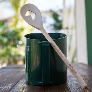 Träsked med St. Hippolyt-logotyp och utskuret hästhuvud. Perfekt för att blanda foder, gärna med vatten. Du kan också beställa två mash-skedar och använda dem som salladsbestick!